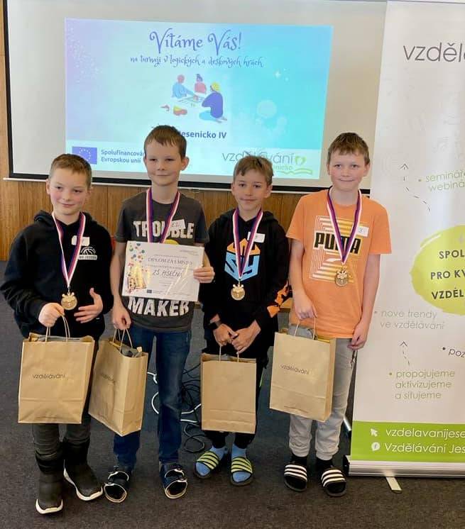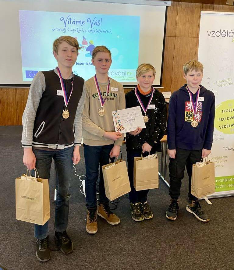 Jesenicko opět ožilo deskovými hrami: Třetí ročník turnaje zná své vítěze02.04.2025 Logika, strategie a napětí – i tak by se dala popsat atmosféra třetího ročník Turnaje v deskových a logických hrách, který přilákal desítky nadšených žáků z celého ORP Jeseník. Soutěžící poměřili své síly ve dvou kategoriích, přičemž nejlepší týmy si odnesly nejen cenné trofeje, ale i skvělé zážitky. Díky pečlivé přípravě učitelů, kteří prošli speciálním workshopem, se žáci mohli s hrami seznámit a předvést v turnaji to nejlepší. Kdo letos triumfoval? Čtěte dále! Jesenicko se opět proměnilo v arénu logického myšlení a strategického umění. Již potřetí se totiž uskutečnil Turnaj v deskových a logických hrách. Oblíbená akce pro žáky základních škol z celého ORP Jeseník proběhla v polovině března. Turnaj, rozdělený na kategorie pro první a druhý stupeň, přilákal desítky mladých nadšenců do světa deskových her. Celé akci předcházela pečlivá příprava. Učitelé zapojených škol se zúčastnili speciálního workshopu, kde se nejen sami ponořili do tajů „deskovek“, ale také obdrželi balíčky her pro své žáky. Díky tomu mohli pedagogové následně předat své nově nabyté znalosti a nadšení svým studentům, kteří se tak mohli s deskovými hrami blíže seznámit a připravit se na samotný turnaj. A příprava se vyplatila! Žáci obou stupňů předvedli během turnajového dne skvělé výkony. V kategorii prvního stupně nakonec nejlépe obstáli žáci ze ZŠ a MŠ Písečná, kteří si odnesli zasloužené první místo. Na druhém místě se umístila ZŠ Česká Ves a bronzovou příčku obsadila ZŠ Vápenná. Ani žáci druhého stupně nezůstali pozadu a předvedli strhující bitvy mozků. Z vítězství se radovali žáci ze ZŠ Vápenná, kteří tak potvrdili skvělou formu školy i v této kategorii. Stříbrnou medaili si odnesla ZŠ a MŠ Bělá pod Pradědem a třetí místo získala ZŠ Mikulovice, okres Jeseník. Akce byla uspořádána v rámci projektu MAP Jesenicko IV. Organizátorům patří velké poděkování za skvělou organizaci a za to, že i letos dokázali pro mladé lidi vytvořit inspirativní a zábavnou událost. Tato akce byla skvělou příležitostí pro žáky, kteří měli možnost poměřit si své logické a strategické schopnosti a prožít den plný zábavy a fair play.