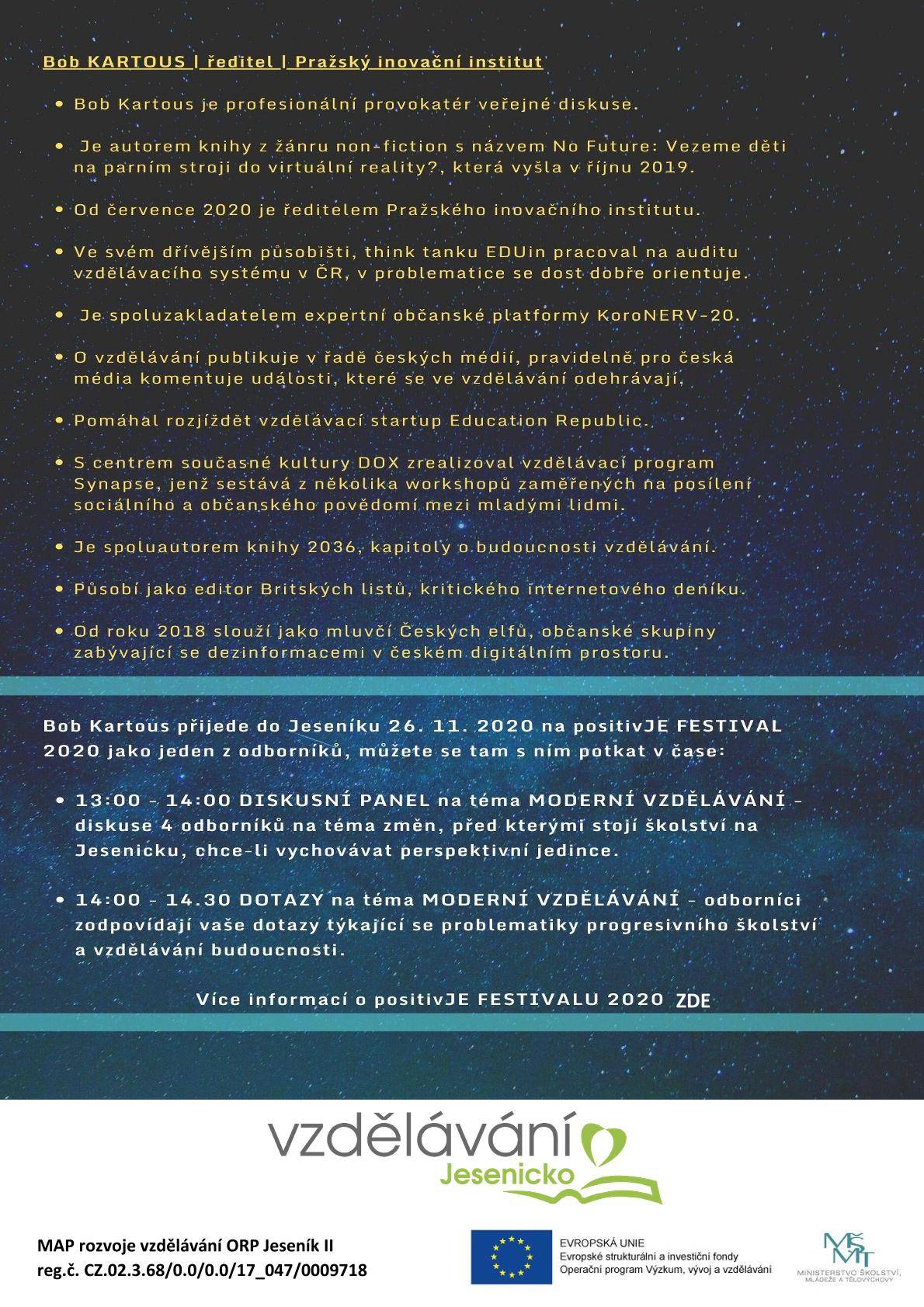 Bob Kartous přijede do Jeseníku 26. 11. 2020 na positivJE FESTIVAL 2020 jako jeden z odborníků, můžete se tam s ním potkat v čase: