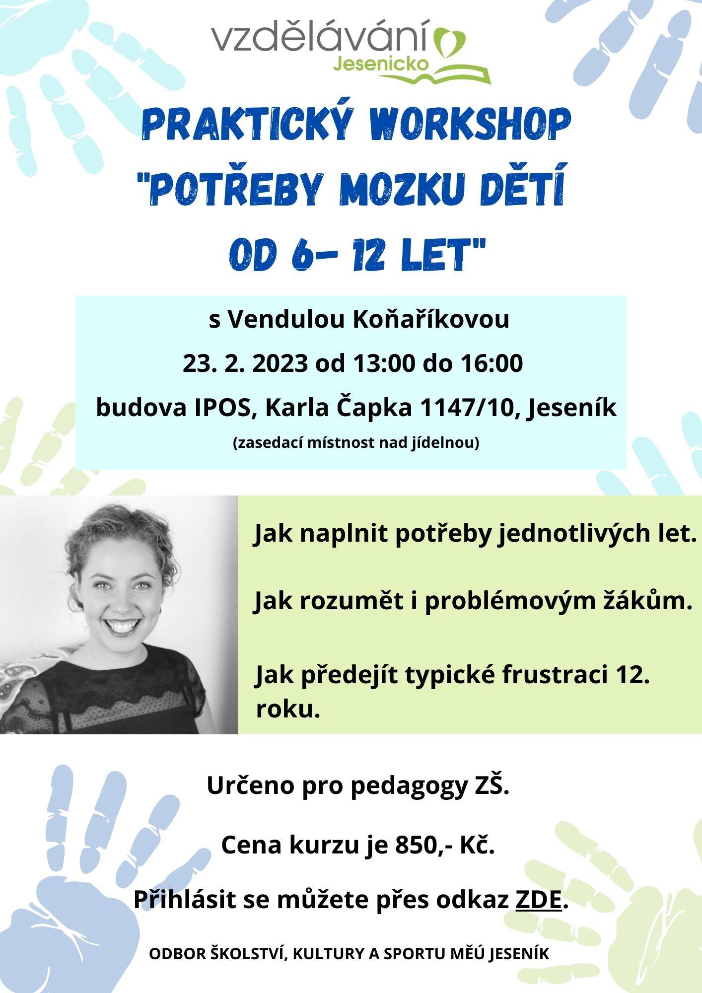 23. 2. 2023 Vendula Koňaříková - Praktický workshop "Potřeby mozku dětí od 6 - 12 let", ZŠ.Založeno: 23.02.2023 08:00 | Poslední příspěvek: 23.02.2023 14:52 | Počet příspěvků: 0 | |